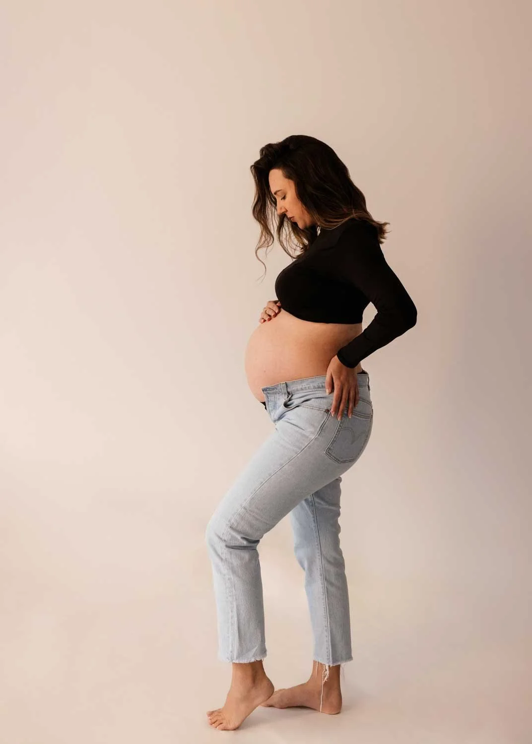 If you’d love a more personal or relaxed feel to some of your images, you’re also welcome to bring along a pair of jeans that you feel comfortable in. Worn open or styled gently under the belly, they can add an effortless, intimate touch to your gallery. Also feel free to bring a robe to wear during outfit changes.