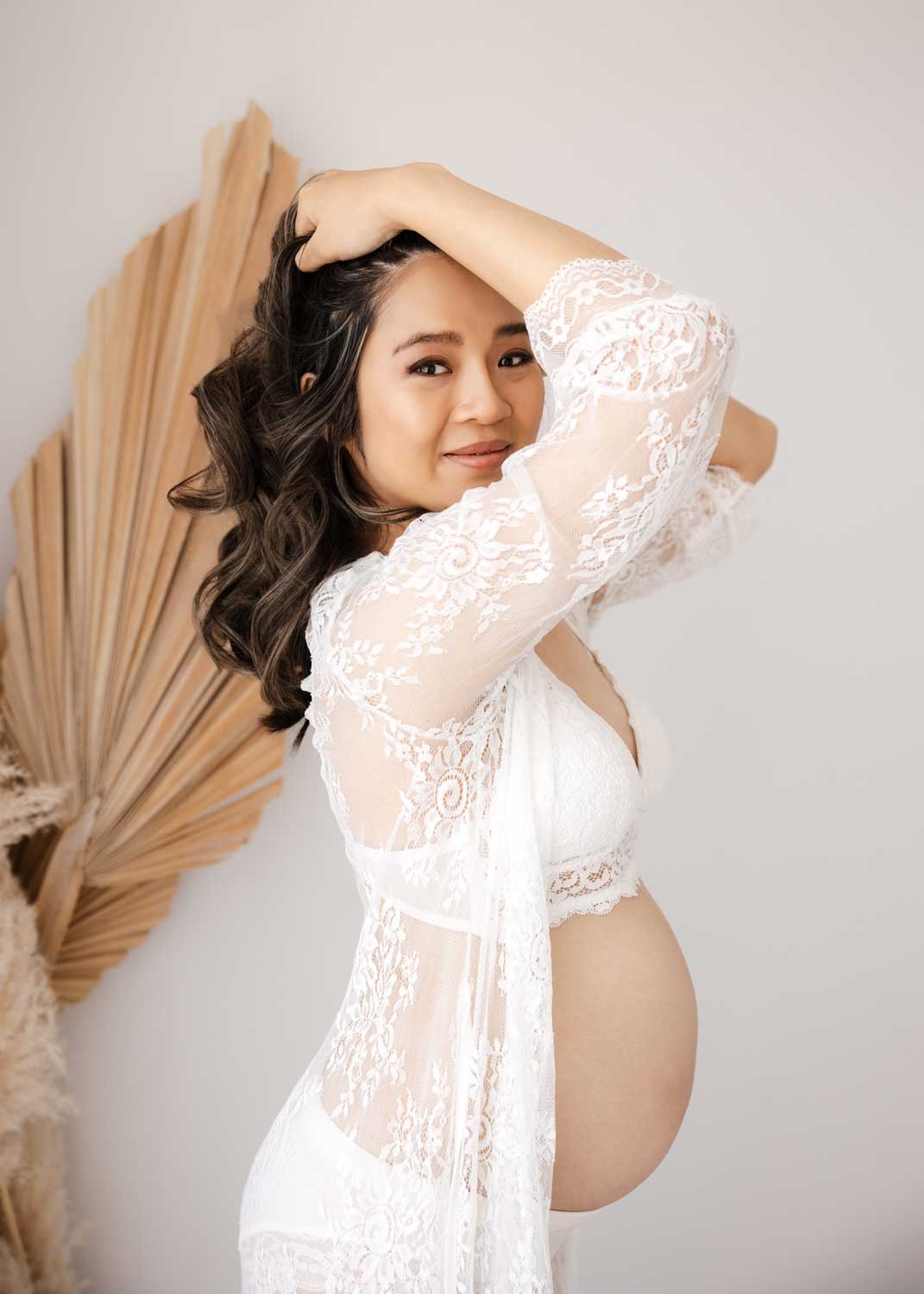 With dramatic sheer layers and striking contrast, this look brings movement, energy, and personality into the session while still remaining refined and intentional. It’s light-hearted without being novelty — a reminder that maternity portraits can be expressive, modern, and fun.